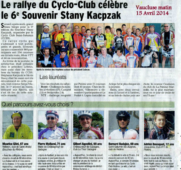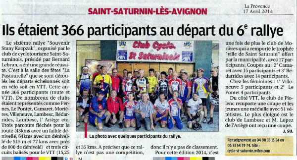 Et ce fut le cas. Ce ne sont pas moins de 366 participants qui se sont inscrits pour sillonner nos magnifiques routes et sous bois de Provence. Les ravitaillements et récompenses furent à la hauteur des attentes des cyclos et cela ne peut que réconforter le staff du CCSS pour l'avenir.............vivement l'édition 2015 !!!