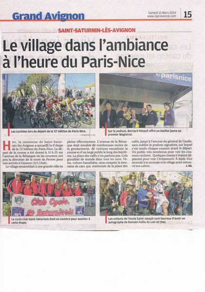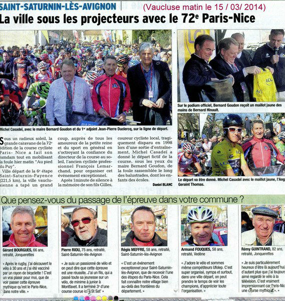 Le vendredi 14 mars 2014, ST SATURNIN LES AVIGNON accueillera la course cycliste professionnelle PARIS -NICE organisée par ASO.