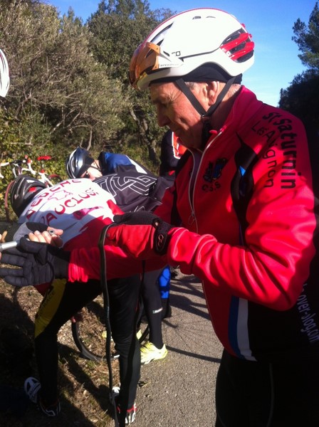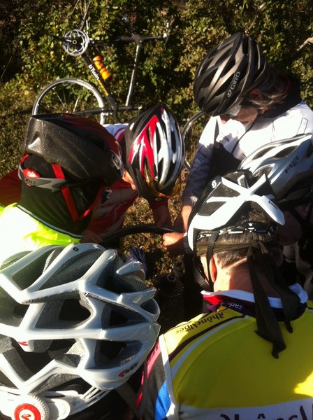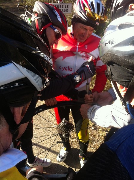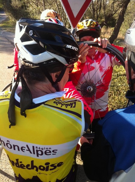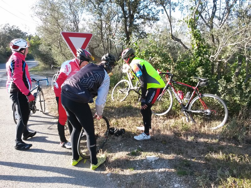 Cette journée fût aussi marquée par la première crevaison de l'année......Si l'habillement de saison ne nous permet pas d'évoluer en toute aisance, nous avons pu constater que les esprits d'aide et de camaraderie étaient et seraient encore le fer de lance du club en cette nouvelle saison...Ce n'est pas moins de 4 cyclos voir plus avec les relais.....qui se sont affairés autour d'un malheureux pneu qui se sentait raplapla.......