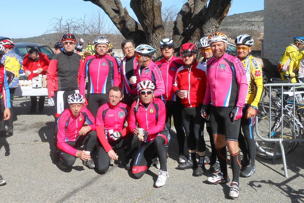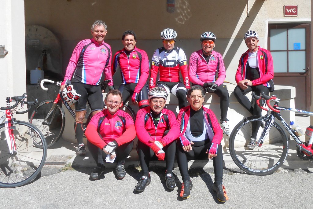 Au départ de Vacquéras, nous étions une vingtaine, mais seulement quinze sur la photo souvenir. (Michel Casadeï, Lucien, Hervé, le Grand Georges qui étaient déjà partis, Marc était à sa voiture)