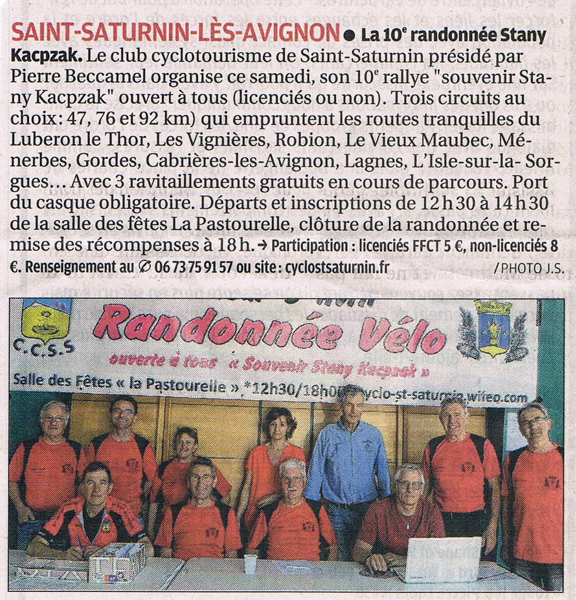 305 cyclotouristes ont pris part au 10ième "souvenir Stany kacpzak"- Challenge du nombre Morières avec 23 participants arrivé en première place, Camaret 2ième,Serre et les Baskets Fumantes 3 ième . De nombreuses récompenses dans les diverses catégories d'hommes et femmes ont été attribuées ainsi qu'une tombola gratuite avec ses 30 lots ont réjouis les gagnants dans une atmosphère conviviale.